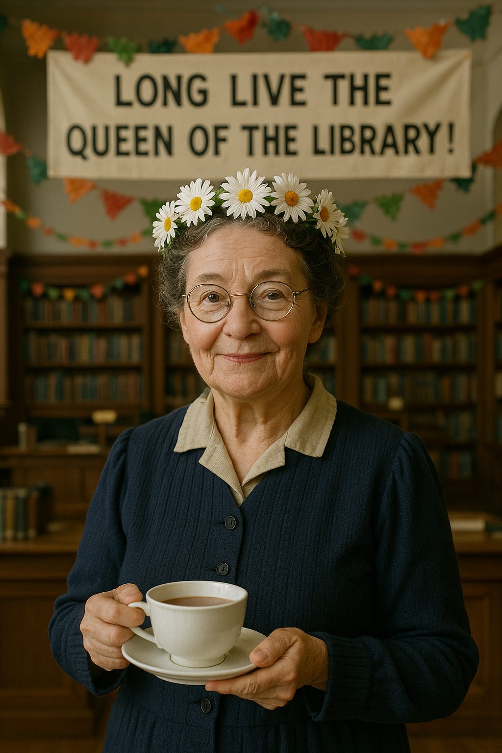 Someone brought tea. Someone else placed a daisy chain upon her head. A patron from the genealogy section played “Greensleeves” on his phone. It was absurd and wonderful.