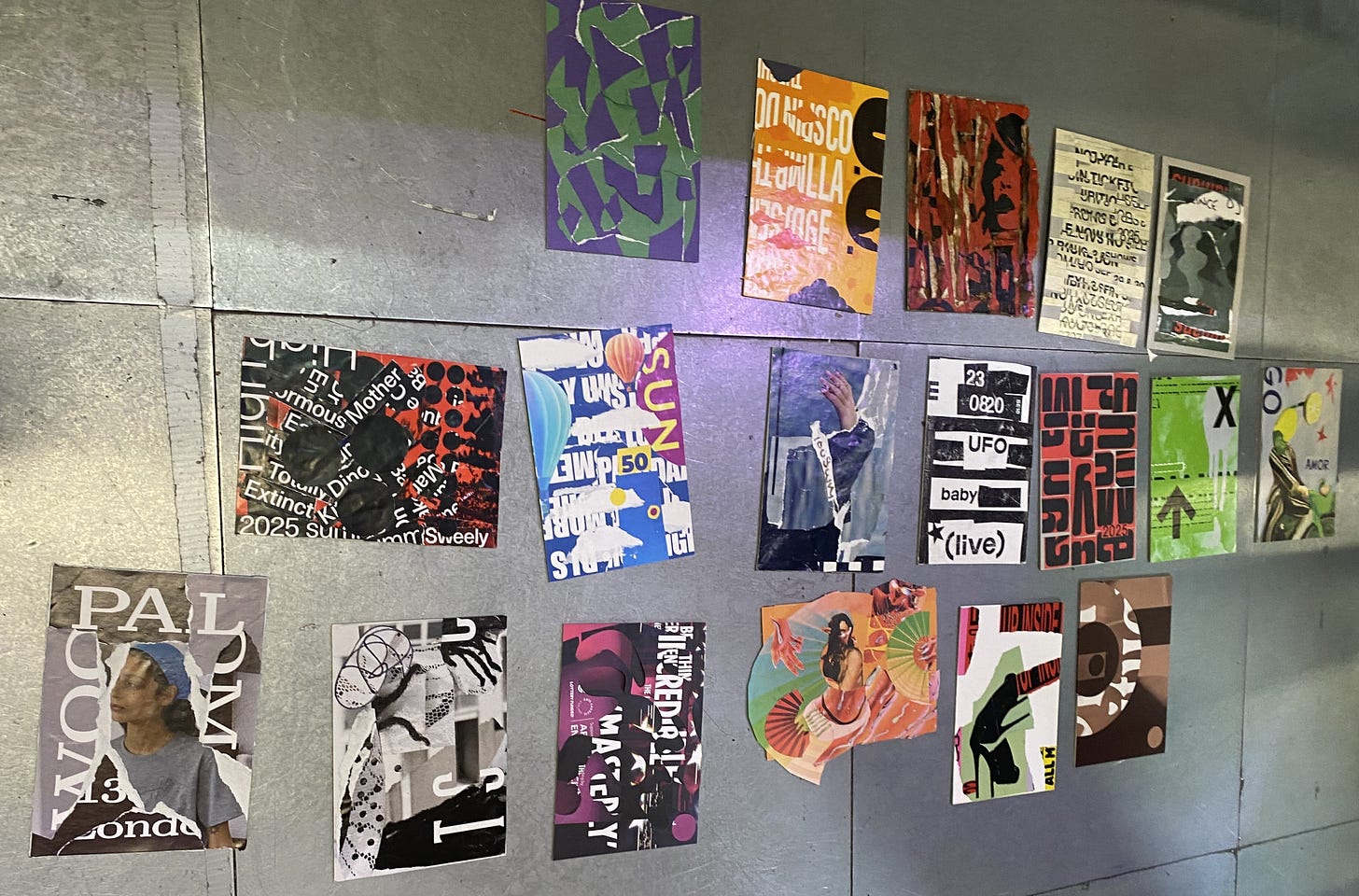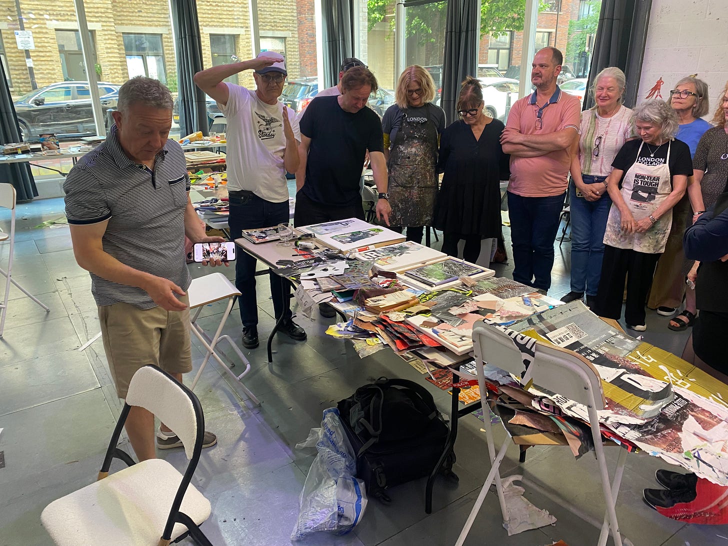 Top two photos were related to a challenge. Les happened onto a poster applier guy who had a whole truck of posters he was putting around. Les talked him into giving a sample of each poster he had and the guy gave him a roll of posters. Later Les gave everyone a poster and then challenge was to make a collage from the posters in 30 minutes time.