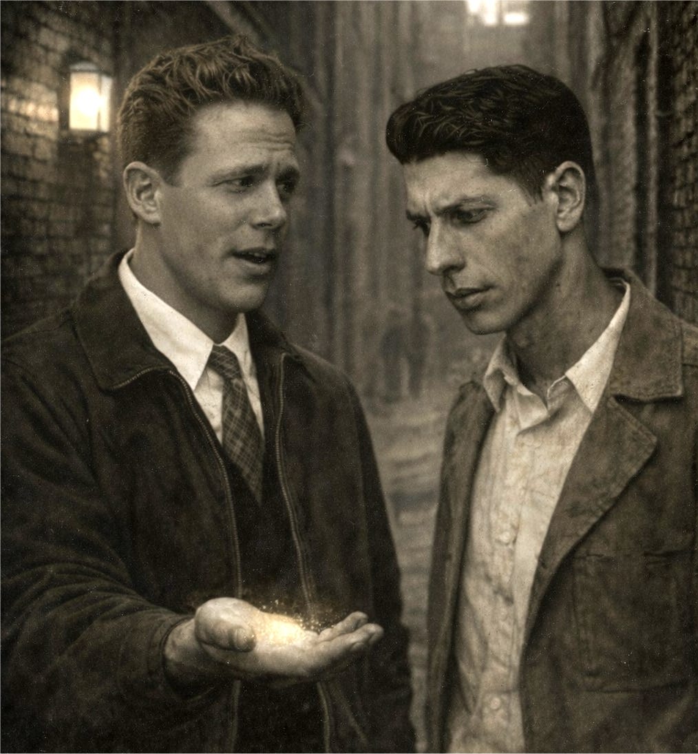 Frank says; “In fact, this thing, that I don’t know what it is, has yet to come into existence as possibly some sort of McGuffin – I make no apologies for it – and, for that matter, Bob, I am making you up as well. Currently you and the thing I am trying to get you to try are just larks of my imagination, a momentary experiment in writing something.”