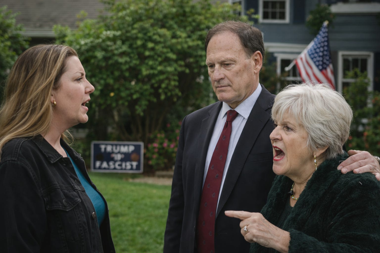 And after all that, after the signs and the stares and the near-spits and the nameknowing and the trashcan theatrics and the justice standing there like an upholstered conscience in loafers, there appeared in due course the famous upside-down flag itself.