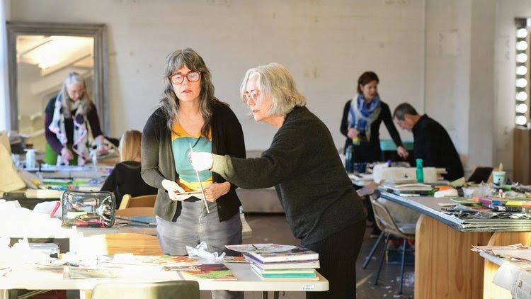 “I found the whole experience exhilarating. Working alongside like-minded, extraordinary artists who generously shared technical approaches and ideas was energising and inspiring. Our work space was like a field of wildflowers with dazzling collages constantly blooming around the room. I will always remember the atmosphere of camaraderie, the good humour and the endless creativity we shared that week in London.”