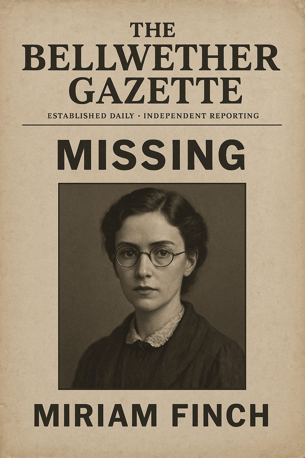 The search for Miss Miriam Finch, missing librarian of the Bellweather Public Library, resumed yesterday with no new evidence reported. Sheriff Harold Knox confirmed that volunteers again combed the riverbank and the grove near the Hollow Tree. “We will keep at it,” Knox said, “until we have an answer.”