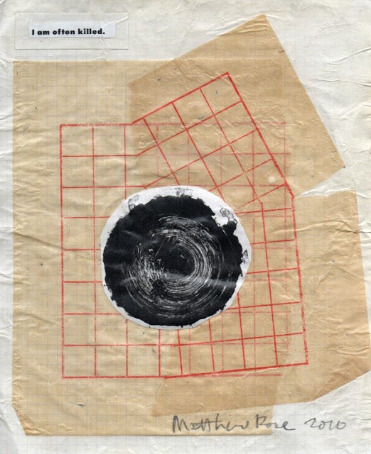 Making art is clearly one of the strangest things humanity has fixed on. My thinking has always been “I’m making this to see what it looks like.” But in reflecting on your text I’m a bit more aware that the chasm yawning from creation to perception, whether my awareness or any future audience’s awareness reminds me of how this world got built. As if no one was looking. Matthew Rose