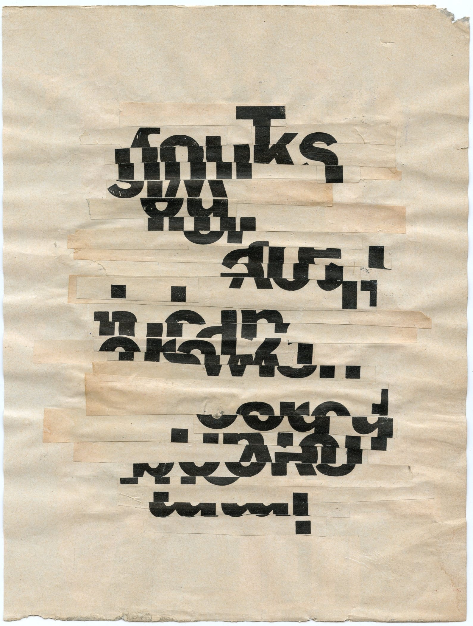 You can let your eye wander across torn edges and typographic rhythms the way it might wander across stones in a creek bed. You can enjoy the composition as shape, density, interval, breath. Language returns to being texture. Tone. Movement. Silence punctuated by marks.