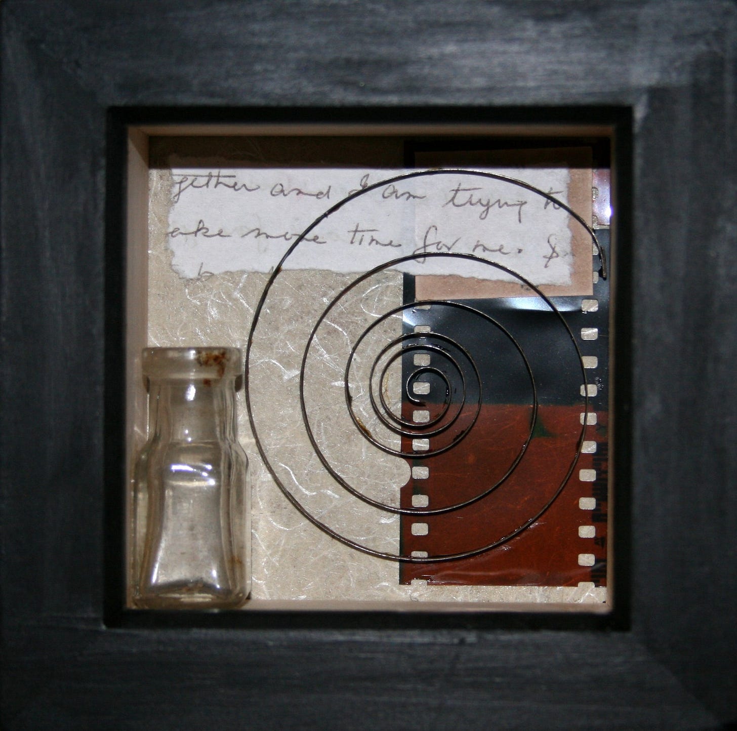Dust gathered on them slowly. The small objects that composed them - bits of wood, rusted hinges, fragments of printed language, old photographs, stray hardware, pieces of colored paper - had once been carefully brought together under a particular mood of attention. For a while they held their conversation well.