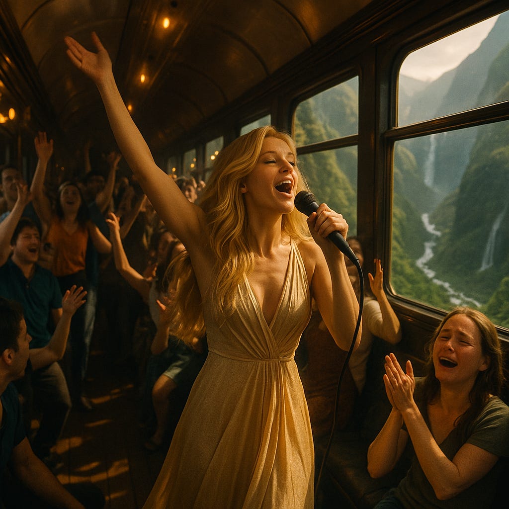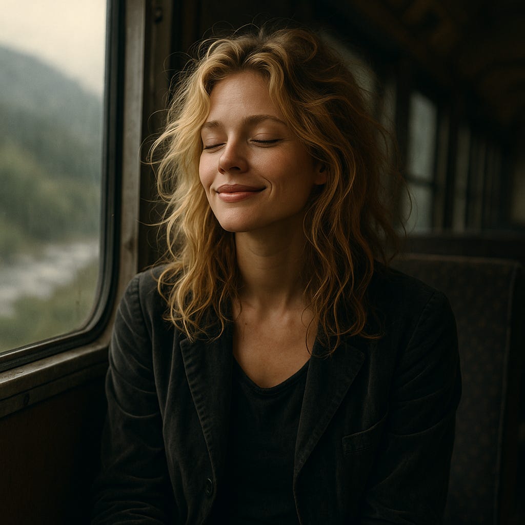 I woke on a moving train, though it was unclear whether I had boarded or simply awakened there. The rhythm beneath me was metallic and alive. The carriage swayed through mist, and across from me sat the singer, half-asleep, her hair in wild disarray, a half-smile still clinging to her lips as if she were dreaming herself.